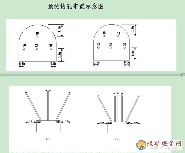 (3)巷道未沿底板掘进,还必须对底煤进行预测控制,底煤厚度小于5m时,在掘进工作面中部靠近底板布置预测钻孔,控制底煤全厚。钻孔直径均为42mm、深度8~10m。底煤厚度大于或等于5m时,在掘进工作面底板两侧布置两个预测钻孔,一个孔与巷道轴线方向向下呈30度夹角;另一个孔与巷道轴线方向向下呈45度夹角;钻孔直径均为42mm、深度8~10m(掘进方向投影孔深)。