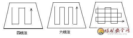 六、测风时,测风人员可采用路线法或定点法测定。用定点法测风时,测风人员背向巷道帮,右手持风表并向右侧前方伸直,手臂和身体胸面成105°~110°的角度,测风时速度要均匀,风表距巷道周壁为0.2m左右。巷道断面在10m2以上时测120s,巷道断面在4~10m2时测60s。用路线法测风时,风表在测风断面内按规定线路、规定时间内匀速移动,根据断面大小,分四线法、六线法和迂回八线法。如下图所示: