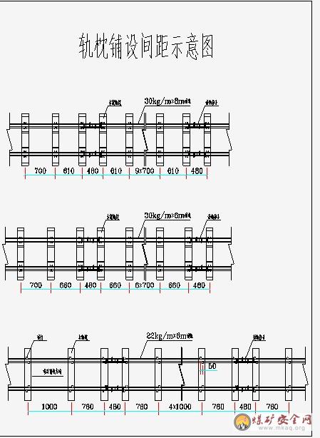 5、轨枕、岔枕及其所用材料的品种、材质、规格、强度必须符合设计规定。木轨枕、钢轨枕的防腐应符合设计规定。600mm轨距道轨使用的轨枕规格为长×宽×高=1200×150×150mm,木料必须坚韧而有弹性。