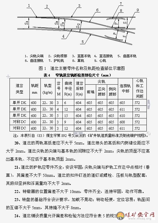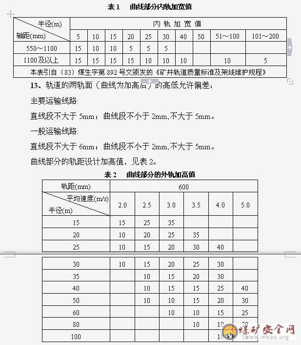 11、轨道的轨距允许偏差:主要运输线路为不大于设计5mm、不小于设计3mm;一般运输线路为不大于设计6mm、不小于设计4mm。曲线部分的轨距设计加宽值见表1。