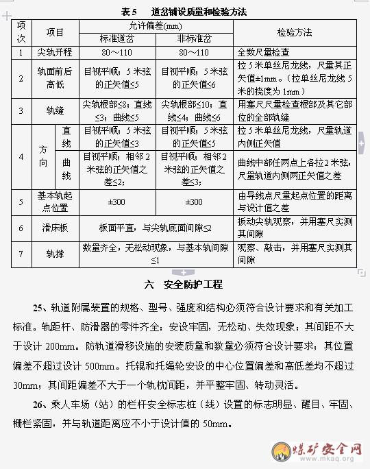 8、轨枕、岔枕的间距允许偏差:主要运输线路为±50mm;一般运输线路为±100mm;岔枕为±50mm。轨枕、岔枕的中心位置允许偏差:均为±50mm。