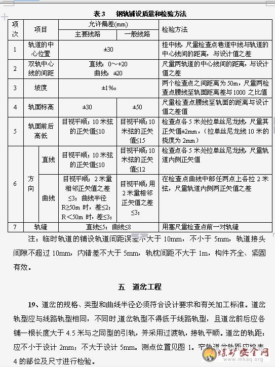 4、道床铺设的中心线与设计值的允许偏差值:主要运输线路应不大于50mm;一般运输线路应不大于100mm。道碴道床的表面标高的允许偏差±50mm。混凝土固定道床的允许偏差:厚度±20 mm、宽度±50 mm、表面标高±20和表面平整度的允许偏差≤10 mm。在固定道床上需预留的孔洞,应符合设计要求。