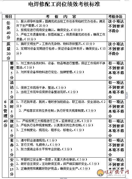 电焊修配工岗位绩效考核标准
