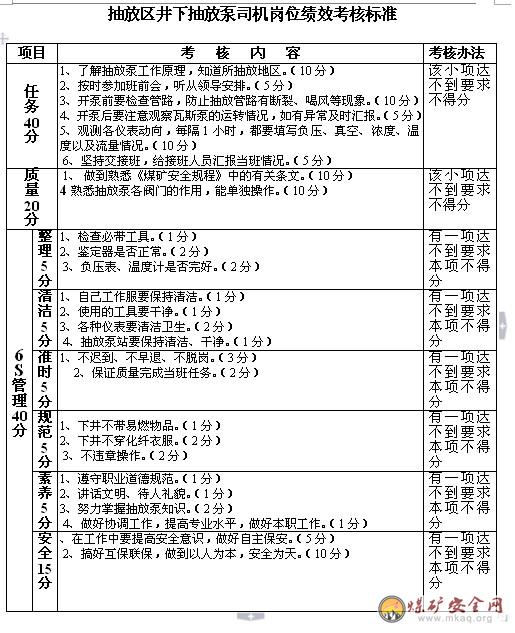 抽放区井下抽放泵司机岗位绩效考核标准