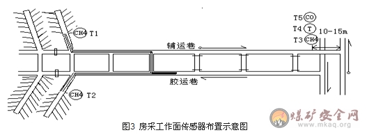 (1)房采工作面及其回风顺槽,传感器应按图3所示设置。工作面甲烷传感器设置在风筒对侧,距迎头不大于5m的范围内。