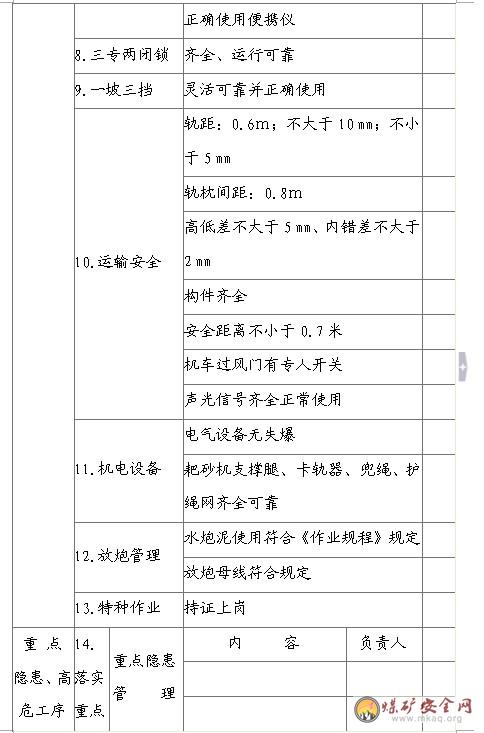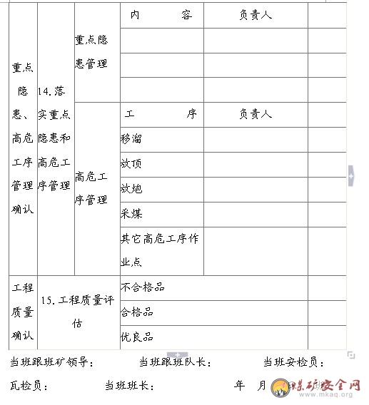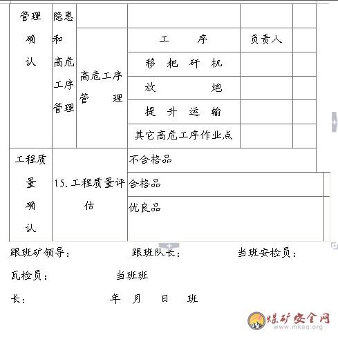四安全确认不仔细、确认的安全隐患处理不及时、不彻底而导致事故的发生,将追究现场跟班区队长、安检员和班组长的直接责任。