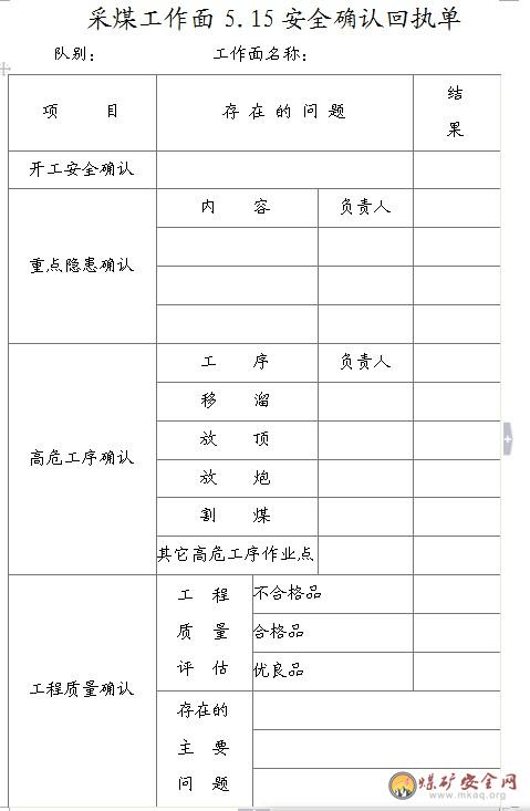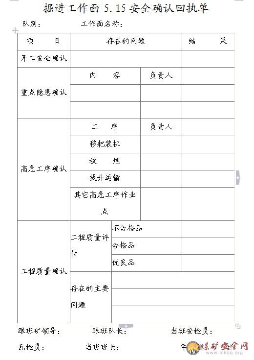 七不严格执行“5.15”安全确认回执单,弄虚作假者,一经发现分别对当班跟班区队长、安检员各罚款100元,并纳入当月“双基”考核,同时,安检部月底对照回执单上所填隐患进行考核。