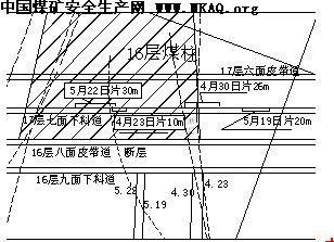 由于16层九面的回采的采动影响,使16层老顶重新活动,产生地震波,16层九面回采至16层八面所遗留的煤柱右边界时,遇到断层,采面过断层要放炮震动岩石层,产生震动波。地震波与震动波相互作用于17层七面下料道的顶板,震动波使贴帮木柱松动,地震波使顶板瞬时沉降,故形成冲击矿压的诱发条件。