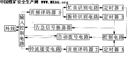 (4)电话监控原理图:它包括输入控制电路、自动拨号电路、音频译码、忙音及振铃回音识别电路、告急信号产生电路、铃流接收及译码定时电路、控制电路组成,如图4所示。