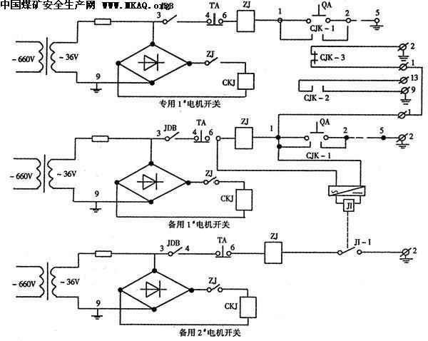 专用局部通风机和备用局部通风机的切换接线见图2。专用局中通风机开关1#外加一组常闭辅助触点CKJ-3,并把它并联于备用局部通风机开关1#的自保接点1、2上,当专用局部通风机开关1#启动,延时10~20s,备用局部通风机2#开关先导回路导通,备用局部通风机2#电机启动。