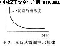 煤层揭露时,煤层揭露面原始的瓦斯存在的平衡条件遭到破坏,煤层揭露面的瓦斯压力突然降到与揭露处空气的绝对压力相等。吸附在揭露面的瓦斯迅速释放到空气中去。同时靠近揭露面煤层内的游离状态瓦斯通过与外界沟通的煤层裂隙缓慢释放,煤层瓦斯压力逐渐降低,该处和瓦斯存在平衡也遭到破坏,吸附状态的瓦斯逐渐释放,同时深部的游离状态瓦斯通过孔隙不断进行补充,达到新的动态平衡。平衡后的瓦斯压力比原始煤层的瓦斯压力小;与深部煤层的瓦斯压力形成压差,又破坏深部的瓦斯存在平衡。这样逐步向煤层深部发展,形成不断变化的瓦斯压力梯度;同时释出的瓦斯流线不断增长,阻力不断变大,煤层瓦斯涌出速度与瓦斯释放阻力成正比。随着煤层揭露面的时间长,煤层瓦斯涌出量随时间大致按指数函数关系逐渐衰减,如图2所示。