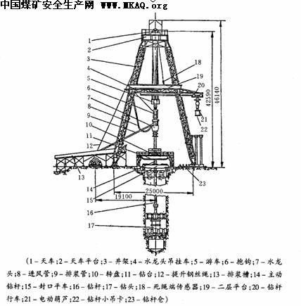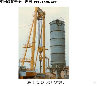 德国工程师肯特(Kind) 1850年用改造的冲击钻钻成了世界上第一个直径4.25m,深98m的井筒。1871年德国工程师霍尔格曼(Honigmann)研制了超前孔直径2m,经11次扩孔达到7.65m,可钻深512m分级扩孔的旋转钻机,至上世纪中叶,在西欧钻了40余个井筒,最大钻进直径7.53m,深度422m,该钻机的基本形式和工艺沿用至今。20世纪70年代德国生产的L-35,L40型钻机均属此类(图5)。