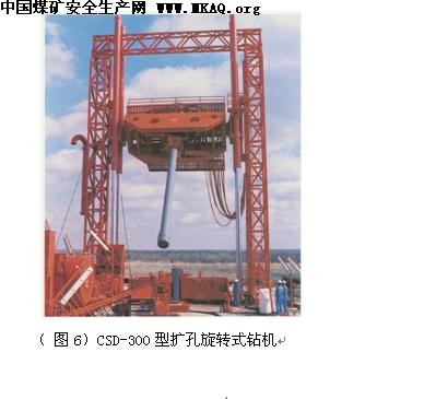 美国1910年开始研究钻井法凿井,美国钻井界认为,当钻井直径<3.6m时,钻井法具有最佳经济效益。因而在小直径硬岩钻井设备和技术方面处于领先地位。1980年为煤矿和铀矿建设需要,休斯公司在70年代生产CSD-820钻机的基础上,经过改型、扩大钻机能力,研制了CSD-300型钻机(图6),设计最大钻井直径6.096m,最大钻井深度609.6m。1981年10月在澳大利亚西部的阿格纽镍矿岩层中,钻成一个直径4.267m,深663m的风井。罗宾斯(Robbins)公司研制的RM系列反井钻机也很成功。