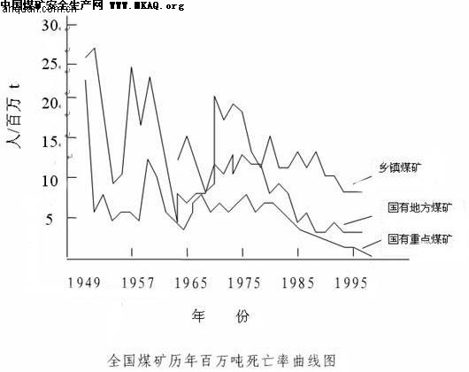 从图中可以看出,建国后各年度百万吨死亡率虽较1949年有大幅度下降,但由于国家的社会环境、经济条件、企业管理的变化,煤矿安全状况存在反复情况,建国后煤矿安全先后出现过三次事故高发期,就是建国初期的恢复时期,受三年大跃进影响的“二五”时期和“文革”十年动乱影响的“四五”、“五五”时期。从上看出煤矿安全状况与社会经济、法制以及抓安全的观念联系是非常紧密的。正如国务院副总理在《以对党和人民高度负责的精神,扎扎实实做好安全生产工作》中说的:“必须树立科学的发展观,坚持统筹兼顾,协调发展,把安全生产纳入经济、社会发展的总体布局,做到同步规划,同步实施,同步发展。”而《决定》对安全生产重要性认识中提出:“做好安全生产工作是全面建设小康社会,统筹经济社会全面发展的重要内容,是实施可持续发展战略的重要组成部分,是政府履行社会管理和市场监管职能的基本任务,是企业生存发展的基本要求。”通过上述论述,阐明一个观点,安全是社会发展的重要内容,要求我们树立安全的社会价值观,处理好安全与人权、安全与经济、安全与政绩、安全与发展的关系。