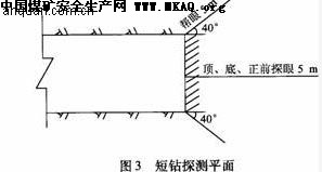 短钻探测补充了长钻探测存在的不足,无论长钻探测前方有无异常,都必须坚持短钻探测,坚持“先探后掘”。实践中,为提高探测效率,减轻劳动强度,提高掘进速度,在探测中,力争减少不必要的重复探测,但是对前方情况每小班都必须做到清楚明了。
