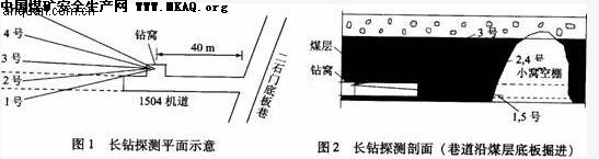 实践证明,短钻探测效果比较理想,通过对前方5m的距离进行全方位的探测,基本避免了冒险掘进,尤其在预防水害中,有许多成功的例子。2004-01-02中班,该矿1490煤掘进工作面就采取短钻探出一小窑空棚,空棚内储存有大量积水,成功的预防了一起重大透水事故的发生。当时,在已知前方有小窑空棚的情况下,继续在巷道右拱部打短钻,打到2.8m深时,孔内有出水,水有压力,孔周围也有渗水。现场安监员意识到情况异常,当即命令不要拔钻杆,撤出了工作面上的所有人员,随后矿上命令暂时停掘该工作面。到1月5日中班,积水压垮煤壁“轰隆隆”几声突然涌出,涌出水量约为1800m3。由于事前采取了短钻探测、停拔钻杆、停掘工作面、撤出人员、密切观察等措施,这次透水未造成人员伤亡。
