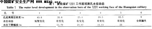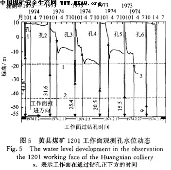 实际观测表明,含水层的水位下降与开采形成的导水裂隙通道紧密相关.图4为淮北朱仙庄矿84-15四含水文观测孔水位变化曲线,2000年3月以前水位缓慢下降,200。年3月开始84-15钻孔邻近的84采区开采,导致了钻孔水位的急剧下降.黄县煤矿在进行含水砂层下采煤试验中,在1201面沿走向布置一组观测钻孔,在回采前后及整个回采过程中进行了为期一年的水位观测,结果如图5及表1所示[6].由表1可见,水位降与钻孔孔底到开采煤层距离有关.由图5可见,孔1水位短暂变化后水位恢复原状,而孔2,孔3,孔4,孔5的水位下降后有所恢复,但在观测期未能恢复原状,而孔6则完全漏失了.因此,为了保护地下水资源,形成的保水开采技术应能使地下水位仅发生孔1所示的变化.