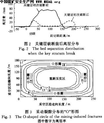 1)沿工作面推进方向,关键层下离层动态分布呈现两阶段发展规律:即关键层初次破断前,随着工作面推进,离层量不断增大,最大离层位于采空区中部.关键层初次破断后,关键层在采空区中部离层趋于压实,而在采空区两侧仍各自保持一个离层区.工作面侧的离层区是随着工作面开采而不断前移的,工作面侧离层区最大高度仅为关键层初次破断前最大离层量的1/3一1/4(参见图2).从平面看,在采空区四周存在图3所示一沿层面横向连通的离层发育区,称之为采动裂隙“O”形圈.