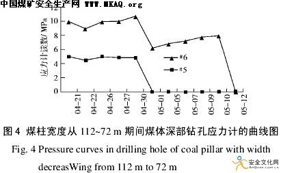 图4是距离分层采场停采线46 m (#5点)和52m ( #6点)处煤体深部20 m处钻孔应力计的曲线图。由图中可以看出,5月1日起,应力值开始急剧下降,说明煤体开始破裂,此时煤柱的宽度为92 m, #5点和#6点分别距离综放面46 m和40 m。依此可以判定,煤柱将以快速变形的方式破坏。
