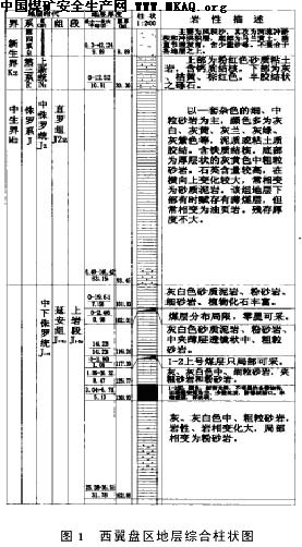 1地质条件 地质构造基本形态为一单斜构造,地层走向为N W25º,倾向为S W65º ,倾角1-3º;断裂不发育,褶曲表现为宽缓的坡状起伏,局部煤层有冲刷,赋存条件极为简单。含煤地层为中下侏罗统延安组。1 -2煤平均厚度为5.21 m。顶板属较稳定型(11级11类顶板),直接顶为泥质砂岩和泥岩,水平层理,致密块状(51103综采面切眼处直接顶厚度0.8-2.4 m) ;老顶为中砂岩和细砂岩,暗灰色,波状层理,块状结构,见图1。综采工作面为倾斜长壁布置,工作面长240 m,推进长度3554 m。