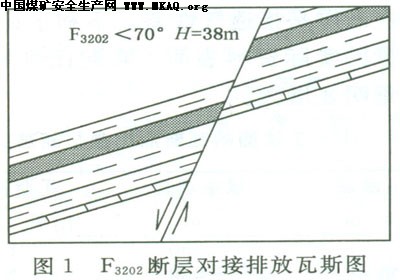 在靠近井田北部边界的F3202断层,在北翼2414工作面一带表现为开放性断层。F3202断层在此处落差38m,倾角70°,倾向NW,二1煤层与对盘C3L8灰岩相连,见图1,断层附近瓦斯涌出量较低,而在煤层埋深基本不变的情况下,离断层较远处的瓦斯涌出量明显增高,见表1。