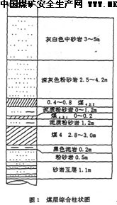 3401西运输巷沿4煤顶板掘进,钻眼爆破法施工,巷道净高2.4m,净宽3. 2m,埋深H=380-410m,走向700m。.位于3202W面下方,掘进过程中将受到3202W面采动压力影响。4煤厚2.8-3.0m,倾角8º,硬度f=1.5-2,与上部2煤层间距14~15m;直接顶为深灰色泥质粉砂岩,厚1.2~2. 2m,岩石抗压强度22-45MPa,层理发达,裂隙一般,局部夹4煤上1,其上为0.4-0.8m厚的4煤上2,再上为深灰色粉砂岩,厚2. 5-4. 2m;老顶为灰白色中砂岩,厚4. 0m,岩石硬度f=5-6;底板上部为黑色泥岩,厚0. 25m,其下为0. 5m厚的粉砂岩,再下为1. 0-2. 0m中细砂岩。详见煤层综柱状图1。