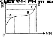 矿井火灾是煤矿的主要灾害之一。在矿井火灾事故中,自燃火灾约占70%,故研究煤炭自燃发火规律,及时采取预防措施,对保证煤矿安全生产,保护煤炭资源有重要意义。煤炭自燃是煤与氧气两相组分在空间发生激烈化学反应的过程,常常放热、发光、生成新物质。按安全流变论,OA段是煤与氧气接触开始氧化阶段,煤刚一暴露在空气中,氧化速度特别快,但随着热量的放出和煤氧复合物的产生,消耗掉周围空间的大量氧气,再由于复合物对深层煤样的包裹,对煤的氧化过程有一个阻滞作用,所以氧化速度减慢,但氧化程度在不断增加。煤的氧化产热量和散发热量大抵相同,氧化速度在A点后几乎为一恒值,热量略有所聚积,温度有所上升。这可能持续一段时间,当温升达到某一值时(B点后),煤的氧化速度突然又要加快,产热多,温升更高,导致煤的氧化速度越来越快,一旦到达D点就自燃发火,形成自燃火灾,完成了煤的自燃突变。突变点B是个关键点,也是一个状态点,可能对应一系列反映发火危险程度的参数。如t≥70°,CO的浓度,煤的干熘产物量。C点是人为设置的报警点,BC段是处理火灾措施段,时间可能很短,却是处理火灾的关键时期,如果处理适当,氧化速度可能下降,氧化程度不变,不能形成自燃火灾。