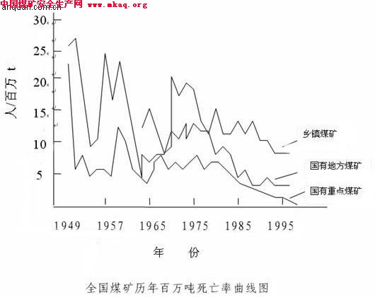 从图中可以看出,建国后各年度百万吨死亡率虽较1949年有大幅度下降,但由于国家的社会环境、经济条件、企业管理的变化,煤矿安全状况存在反复情况,建国后煤矿安全先后出现过三次事故高发期,就是建国初期的恢复时期,受三年大跃进影响的“二五”时期和“文革”十年动乱影响的“四五”、“五五”时期。从上看出煤矿安全状况与社会经济、法制以及抓安全的观念联系是非常紧密的。正如国务院副总理在《以对党和人民高度负责的精神,扎扎实实做好安全生产工作》中说的:“必须树立科学的发展观,坚持统筹兼顾,协调发展,把安全生产纳入经济、社会发展的总体布局,做到同步规划,同步实施,同步发展。”而《决定》对安全生产重要性认识中提出:“做好安全生产工作是全面建设小康社会,统筹经济社会全面发展的重要内容,是实施可持续发展战略的重要组成部分,是政府履行社会管理和市场监管职能的基本任务,是企业生存发展的基本要求。”通过上述论述,阐明一个观点,安全是社会发展的重要内容,要求我们树立安全的社会价值观,处理好安全与人权、安全与经济、安全与政绩、安全与发展的关系。