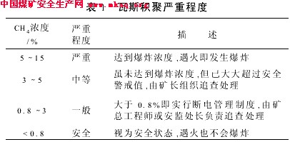 煤矿井下瓦斯在不同浓度下危险程度是不同的,根据2005年3月国家煤矿安全监察局颁布的《煤矿瓦斯治理经验五十条》,现将瓦斯积聚严重程度分为以下4种状态,并予以处理。如表1所示。