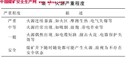 瓦斯的引燃温度为650 -750℃,最低点燃能量为0. 28 m J,明火、煤炭自燃、电弧(4 000℃)、电气火花、赤热的金属表面、吸烟、撞击火花、磨擦火花,甚至静电产生的火花等煤矿井下所能遇到的绝大多数火源都足以引燃瓦斯。所以,考察火源严重程度主要是看该火源在危险的瓦斯环境下暴露的频率。如表2所示。