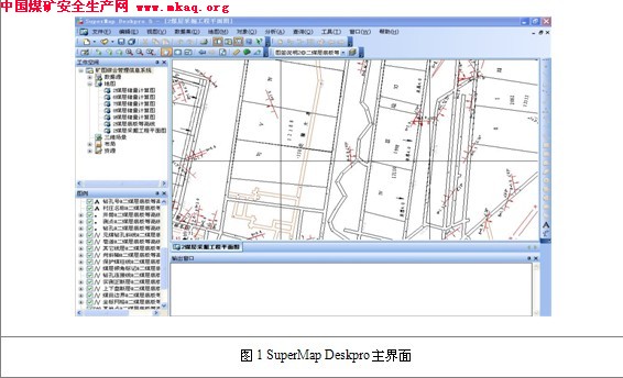 图纸重复性的内容都要重新绘制,浪费了大量的人力和工时; 3. 图纸质量差,标准化和规范化程度低。手工设计绘制的图纸由于设计绘图人员不同和采用的标准不同,因此成图的质量不同,有些图纸由于存在问题可能给生产带来严重的隐患,也可能由于图纸的质量使矿井开采耗费没有必要的人力、物力和财力; 4. 手工设计绘制的图纸普遍存在精度低误差大的问题,有些误差会给生产带来严重的问题。此外测量数据手工填图定位速度慢、精确度低; 5. 图纸资料利用率低,不易保存、交流和管理等; 6. 成本高、效率低、效益差。 1.2.2 SuperMap Deskpro矿图数字化的优点矿图数字化是指采用手工输入、图像扫描、数字化仪、编程自动绘制、直接绘制等方式将矿图矢量化,成为能够用计算机绘制、编辑、修改、保存、输出、交换的数字矢量图形文件。最早进行矿图数字化的是Auto CAD,因此在矿图数字化方面,CAD有着丰富的经验,但是随着地理信息系统技术的不断成熟,且GIS有着CAD所不具有的优点,因此在矿山上的应用也必将越来越广泛了。其主要优点有以下几个方面: 1. 友好、简单易用的界面设计 SuperMap Deskpro的界面非常友好,如图1所示,左边是工作空间目录和图层管理,工作空间能够将所有的数据源、矿图以及布局进行统一管理,方便了矿图的管理和使用。而图层管理则可以根据需求来显示或者隐藏某个图层,同时还可以在此进行更改专题图或符号、线型以及填充的风格。右边则是地图的显示窗口和命令输出窗口,命令输出窗口是用于提示所使用的命令以及如何使用该命令。