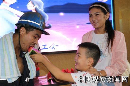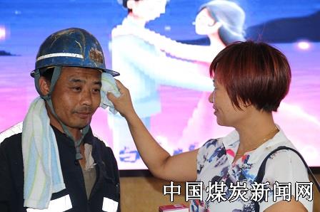 “老公,你可上来了!累不?”虽然脸上满是煤尘,但是爱人还是一眼便认了出来,脸上的焦虑变成了舒心的笑容,直接迎了上去,用毛巾擦拭爱人脸上的煤尘。看到妻子和孩子,刁光银吓了一跳,反过神来,矗在那一股劲的傻笑:“媳妇,你咋和孩子来了呢”“老公,你太辛苦了,七夕节快乐!以后我一定承担所有家务,让你安心上班”当矿嫂高文娟看到刚刚升井满脸煤尘的丈夫时,抑制不住内心的感情,满含热泪的对丈夫说。活动现场,矿嫂们满含泪水,一边用毛巾擦拭爱人脸上的煤尘,一边把早已准备好的解暑西瓜和七夕节礼物递到丈夫手中。一句句饱含爱意的话语,一幕幕感人的画面,凝聚成了满眼的泪水与沉甸甸的安全嘱托。整个活动现场洋溢着浓浓的亲情氛围。