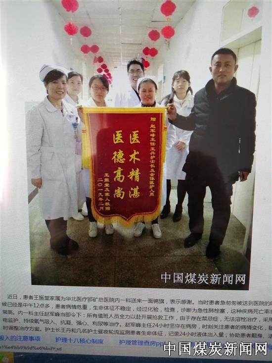 3月25日,患者刘金朝的家属为华北医疗邯矿总医院内四科送来一面锦旗,上面写着“医术精湛 医德高尚”表示对该院内四科医生郝涛利以及全体医护人员的感谢。