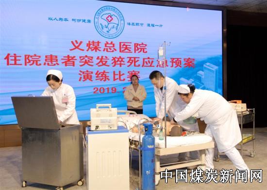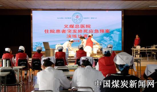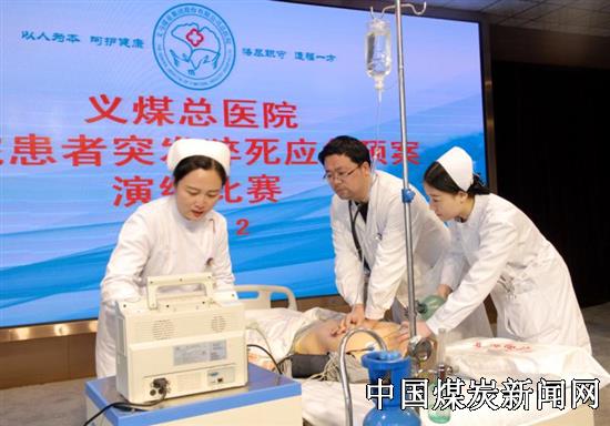 演练比赛采取角色扮演的方法,模拟值班护士在巡视病房时发现一患者突然意识不清,当场做初步判断:患者意识丧失、无自主呼吸及大动脉搏动,立即行胸外心脏按压进行心肺复苏并请旁边家属帮助去护士站呼叫其他值班人员。其他医护人员到达后按照义煤总医院住院患者突发猝死应急预案处置流程,迅速对患者展开抢救,同时做好家属的沟通、安慰等心理护理,经过争分夺秒的抢救,患者复苏成功。