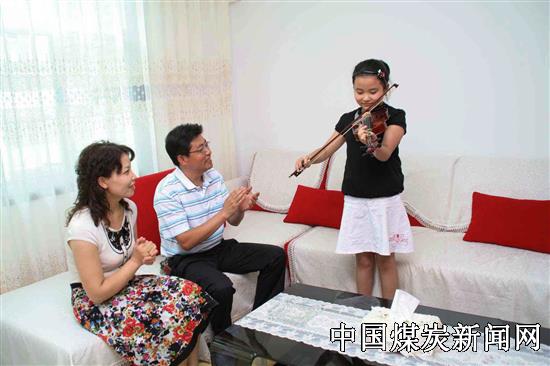 现如今矿区住房条件好了,一家三口之家住在100多平方米的楼房,女儿拉着小提琴 一家三口多么的快乐