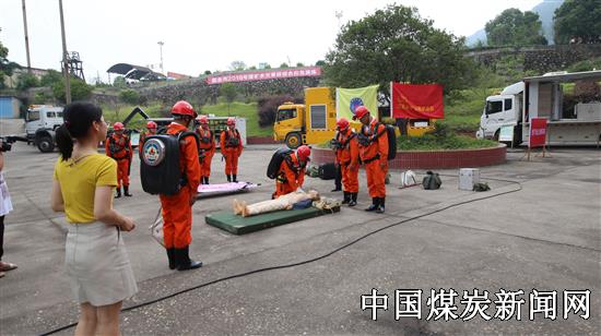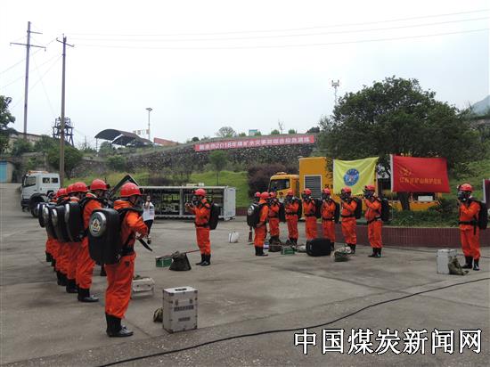 本次演练,江西省矿山救护总队派遣新余大队30多名指战员、4辆国家区域救援装备车,2辆应急救援指挥车参与综合应急演练。演练以江西花鼓山煤业公司山南矿北翼浅部采区-160米运输大巷突水,有人遇险,井下排水告急为事故场景开展。上午10时;新余市副市长徐绍荣宣布演练开始。值班领导按事故汇报程序进行报告后,立即启动应急预案响应,成立应急救援指挥部。设6个组,技术专家组、现场处置组、应急救援组、警戒保卫组、后勤保障组、医疗救护组分头行动,按照《新余市煤矿事故应急预案》开展应急救援演练。