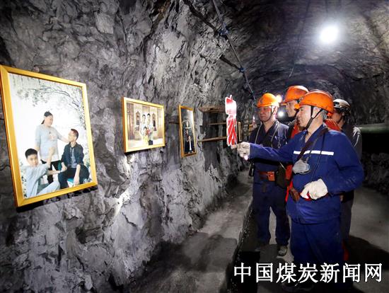 图为矿工们正在驻足观看巷道内的家庭摄影写真“沙龙”展。(胡明军 摄)