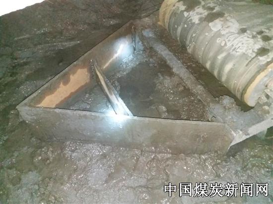 为解决这一问题,在缓冲机尾处设置一“三角形”分泥矸装置,机尾前移时将机尾前淤泥积水分向两侧,从而使机尾下平滑前移,避免了淤泥阻塞皮带、直托辊掉落、不转现象。此工艺适用于综掘工作面的应用,以综掘机作为牵引动力源,在前移缓冲机尾时,安装在机尾部的分泥板将淤泥积水推向两侧,使底板变得平滑,便于清理,避免了人员在二运下清理淤泥带来的安全隐患,节省了材料设备的投入,提高了劳动工效。