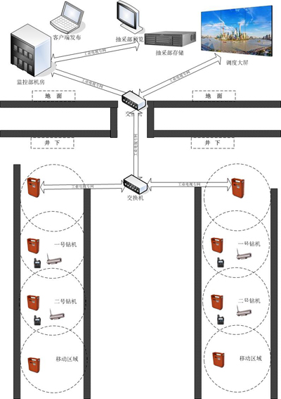 该系统由前端设备、传输设备、中心控制设备三部分组成,采用无线视频监控的方式,通过无线摄像仪全方位采集打钻现场信号,可就近通过工业电视专网将信号及时传至地面使用单位。该系统集视频监控、语音对讲、语音广播、现场监听、安全警示、无线通信等功能为一体,为地面监控管理提供了极大的便利。
