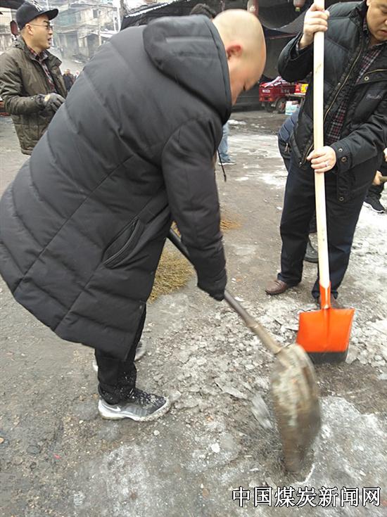 越是在困难面前,越能体现党组织的战斗力和凝聚力。29日清晨,街洞公司及矿区各生产生活道路被冰雪封路,各车辆和行人无法通行。该公司党委书记裴凯雄带领机关党员干部和员工来到茶山岭矿路口开启破冰融雪工作。裴书记不畏严寒,扛起铁铲敲碎凝固的冰霜,抡起扫把使劲把冰雪扫到马路边的沟里……在裴书记的埋头苦干带领下,大伙饱受鼓舞,干劲更足了,纷纷撸起袖子一个个敲冰除雪。