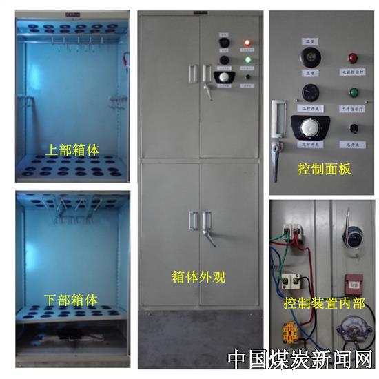该设备由箱体、吊挂装置、通风加热装置和控制装置等几部分构成。主要有三大优点:第一,通过在箱体内安设风扇、加热装置、隔板和导气孔,设备运行时在箱体内形成高速风流,加快呼吸器部件的风干速度。第二,箱体内部设置温湿度传感器,外部设置温湿度显示器、温度设定旋钮和定时开关,可以实时控制箱体内温度的高低,防止温度过高造成橡胶部件的老化。第三,充分利用空间,在箱体内设置挂钩、滑轨卡槽和紫光灯管等装置,不仅可以一次性风干整小队9人的呼吸器各部件,而且还具有消毒杀菌的功能。