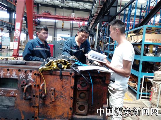 2016年1月17日下午15时,矿机公司接到服务电话,告知松河公司采三区采面工作的采煤机出现故障不能牵引,需要矿机公司派人服务。接到服务指令,不到20分钟,班长陈琳和队员常春柱就已准备好了检修工具和相关的配件,乘车赶往松河公司。到达井下现场,他们2人对机组进行认真检查,发现是齿轮泵花键套磨损导致采煤机压力不稳,需要重新拆开机组更换花键。在井下因作业空间狭窄,给检修带来了很大困难,陈琳、常春柱两人只能侧着身弯着要,艰难的进行抢修,时间在一分一秒的过去,汗水顺着他们的脸颊往下滴,经过连续10多个小时的抢修,齿轮泵花键套更换完毕,重新核对变频器参数后,机组恢复正常,看着采煤机开始重新运行割煤,他俩才放心升井。