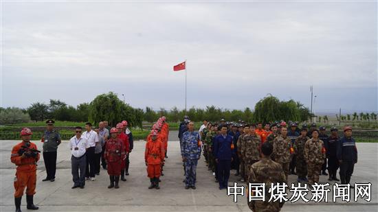 新疆兵团第十师北屯市党委常委、副师长汤建军,北屯市副市长、工信委副主任王军,师市安监局局长卢素凡等出席演练现场进行督导。此次,嘎顺煤矿参加演习人员共计63人,其中指挥部成员11人、井下演练职工14人、应急救援人员8人。
