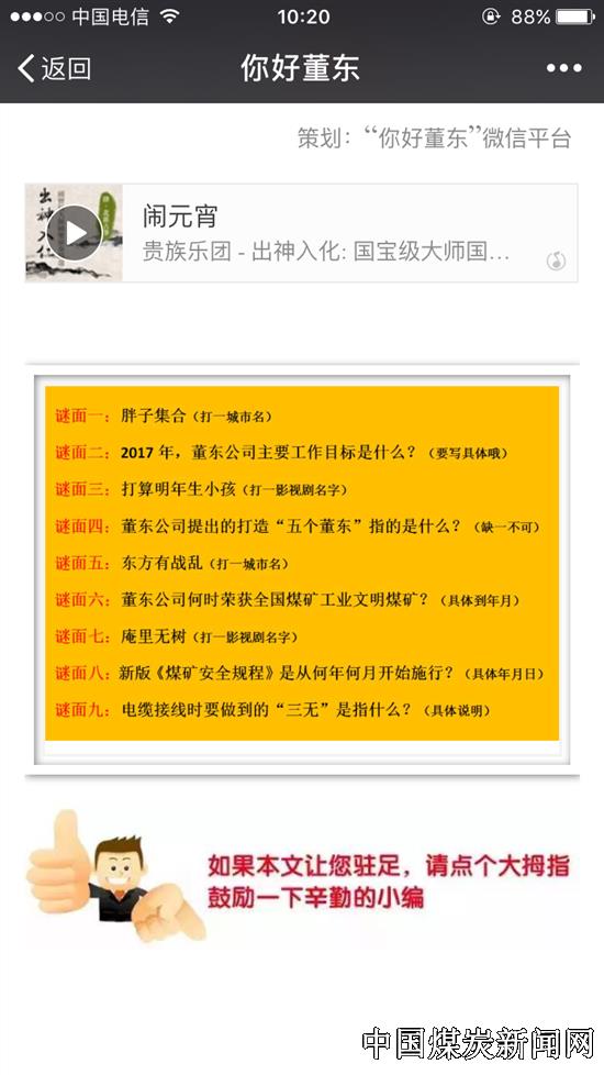 为增强职工们的安全意识,该公司创新安全教育形式,通过“你好董东”微信公众号特别推送了一期“欢乐元宵灯谜赛”的节目。这次谜题活动每期推出9道谜题,职工们可跟帖回复,正确答案和获奖名单隔天公布。岗位安全知识就占到谜面总数的60%是本次猜谜活动的亮点。针对谜题答对的职工,该平台的管理员小董都会单独发放答题奖励“红包”。小董还介绍说“据统计,我们这次谜题活动有529人参与跟帖回复。这个活动让广大员工在娱乐的同时进一步掌握了岗位安全操作知识,同时也对矿井2017年基本思路和政策也有了进一步的了解。这样的安全教育形式,更容易激发职工的主动学习的热情。”