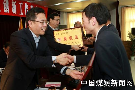 早上九点整,会议在催人奋进的《咱们工人有力量》歌曲声中拉开序幕。会议听取了《推行“1065链式”班组管理 促进班组建设工作向精细化流程化迈进》工作汇报。会上,宣读了矿党政《关于表彰2016年度先进班组优秀班组长和全员创新先进个人的决定》,与会领导为荣获明星班组、优秀班组、星级班组长以及全员创新获奖项目及个人颁发了奖牌和证书。颁奖仪式结束后,宣读《下石节煤矿关于张会民等班长聘用的决定》。该矿掘进二队生产二班班长全海鹏、运输区电钳班班长史卜文同志分别代表优秀班组长代表和技术创新获奖代表在会上作表态发言。