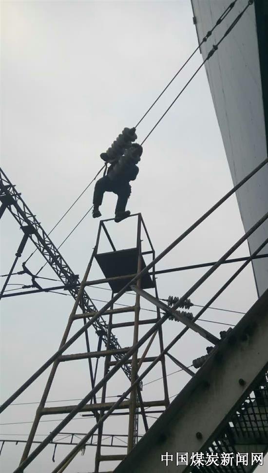 同煤集团塔山铁路分公司集运站装煤仓冬季喷洒防冻液,风力较大,导致防冻液散落在了筒仓附近的绝缘子上,造成了绝缘闪络,危及了接触网供电设备。公司领导得知这一情况,立即召集抢修队员,申请停电作业令。抢修队队员爬上六米的高空对绝缘串进行清洗。由于时间短,任务重,每个队员都积极踊跃的投入到工作之中,不顾晚间天寒风吹,队员们却干得火热朝天,抹布“冻僵了”,他们仍然顾不上冻的通红的双手,继续擦试。手冻得伸不展,他们就用嘴哈这热气,经过近一个多小时的努力,送电成功了,他们露出了笑容可他们的衣服已经湿透了,双手已经冻的伸不出来了。