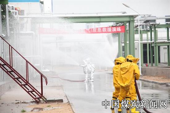 神木天元此次联合演习依据《突发事件应对法》、《国家安全生产事故灾难应急预案》等有关法律法规和规定,制定专门的应急预案,并成立应急指挥领导小组。本次演练以该公司污水装置液氨中间储罐磁翻板液位计法兰口填料泄漏,造成巡检人员中毒为模拟场景。在发生险情后,车间立即对中毒人员进行抢救并最后由120急救工作人员采取进一步紧急救援,启动车间级氨泄漏现场处置方案。车间组织相关人员到现场后立即投用氨罐洗消喷淋装置,并用雾状消防水枪协助抢险组人员检查处理漏点,由于根部阀失效无法关闭,氨气漏量增大,风向不稳,部分泄露气体飘向万邦达公司办公楼,为避免事故进一步扩大,车间向公司领导请示启动公司级应急救援预案。公司领导接到情况报告后,立即启动公司级《中毒事故应急救援预案》,成立联合指挥部。保卫警戒组、堵漏抢险组、医疗组、灭火救援组、现场监测组等救援小组随即赶赴事故现场迅速开展救援,成功完成了液氨堵漏,抑制了泄露事态的恶化。