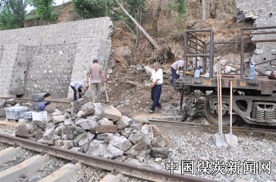 在二矿车站,抢修人员正在对损毁护坡进行修复;据现场负责人介绍,此次暴雨造成了二矿车站线路与煤场交界处2段护坡坍塌,一处为5米,一处为15米,对车辆安全运输造成影响,由于护坡为片石垒砌,施工难度相对较大,预计15天内处理完成,目前正在维护处理。