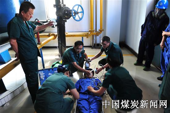 上午9时20分, 随着总指挥一声令下,应急救援演练开始:公司卸酸罐液位计发生泄漏事故,巡检人员中毒昏迷于现场,酸碱库区信号人员迅速发出酸液泄漏的信号,公司迅速启动事故应急预案,进行紧急自救。同时,公司安监部、生技部、保卫部、同煤总院120救护组成的应急抢险组、应急救援组、保卫组、事故抢修组、医疗保障组在总指挥的紧急指挥下火速赶往现场,稀释酸液,救助伤员、查堵泄漏点,分头开展处置救援工作。经过紧张而有序的抢险程序,酸碱泄漏事故得到有效处置,中毒人员得到救护安置。