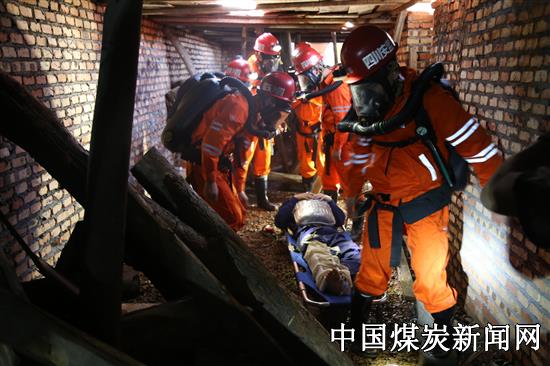 国家矿山应急救援芙蓉队接到灾情抢救命令后,立即集结队伍,拉上救援常规装备,在芙蓉队常务副大队长苟忠、总工程师陈益能带领下,紧张有序,迅速赶赴演练现场各就各位开展工作,历时12分30秒,从演练场地副井搜救出2名轻伤人员,进行简单包扎后迅速护送出井,在“2133采煤工作面”发现顶板冒落,一名工人腿部被埋压,受伤严重,指战员们即徒手搬运垮塌物,成功救出伤员,伤员大声呻吟,经检查发现是小腿开放性骨折。队员们迅速进行对伤员进行止血、包扎、固定处理。
